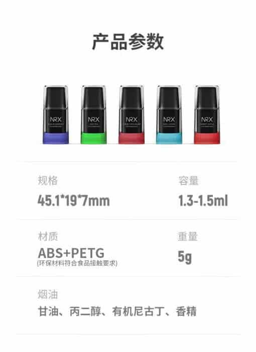 NRX煙彈提供兩種霧化芯:輕柔芯(1.3mL)口感細膩綿柔、回味悠長;呼吸瓷芯(1.5mL)以上萬氣孔同步均勻加熱,霧化充分、霧量澎湃;口味多樣涵蓋荔枝、鐵觀音、冰沙芒果、冰心蜜桃、原味煙草、冰鐵觀音、荔枝薄荷、爆珠藍莓、繽紛水果、冰沙西瓜等,其中荔枝香甜與涼感適中更適合煙癮不大的使用者,鐵觀音則茶香濃郁、基底醇厚且涼度較高;全系列採ABS+PETG食品接觸材質,尺寸45.1×19×7mm、重量約5g,輕巧安全。